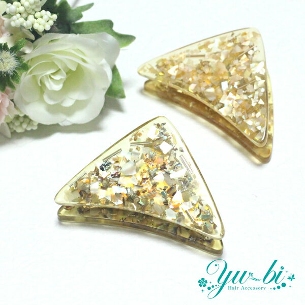 次にご紹介するのは、両サイドのハチ回りの髪をゆるめに編み込み、後頭部でまとめたキュートなヘアアレンジです。マーブル模様がシンプルで可愛い三角クリップを使った上品なスタイルは、毛先を巻いて動きと可愛らしさをプラス。敢えて真ん中にクリップを留めないのが旬ですよ♪